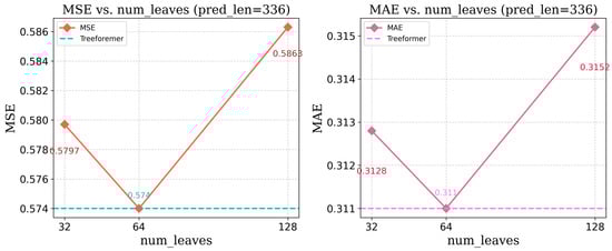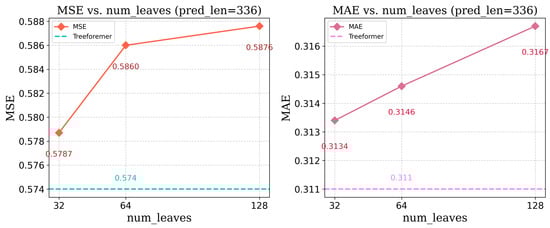 In addition, we conducted further experiments by fixing max_depth = 64 and varying the number of leaves, with . As the number of leaves increases, the model is theoretically expected to capture more complex patterns due to finer partitioning, which may improve performance, particularly on larger datasets. However, as shown in Figure 6, our results show that num_leaves = 32 achieves the best performance in this setting. This suggests that higher model complexity does not always result in better forecasting accuracy and may instead lead to overfitting or unnecessary computational overhead.