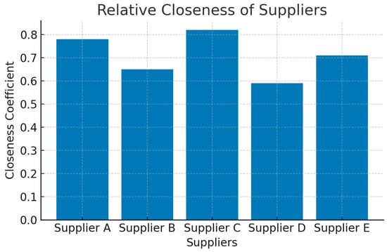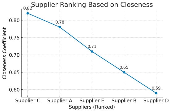 To better illustrate the results of the proposed method, two visual aids are provided in this section. These figures aim to present the relative performance of each supplier and their respective rankings based on the calculated closeness coefficients. The inclusion of these graphics facilitates a clearer understanding of the differences among alternatives and supports more informed decision-making.