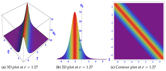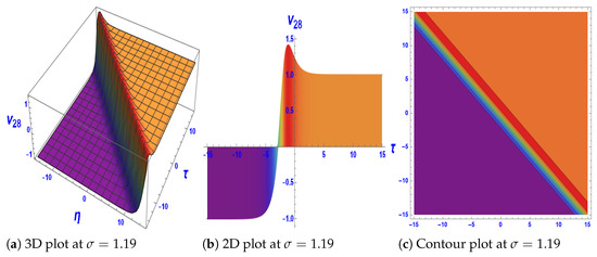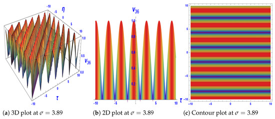 Figure 3: The solution with exhibits kink-type soliton behavior. The domain is , with wavenumber . Such kink-type structures are widely applied in plasma physics and fluid dynamics, where they model nonlinear wave fronts and shock-like solitary excitations [36,37]. Figure 4: The solution for produces a periodic soliton train.The results are shown on , with wavenumber . Periodic soliton trains are significant in nonlinear optics and photonics, where they support soliton lattices used for frequency conversion, switching, and robust energy transport in metamaterials [38,39]