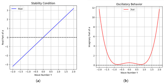 The coefficient , which modifies the impact of perturbations on the wave propagation, determines the system’s stability. In the event that and have opposing signs, perturbations will increase and may result in turbulent or chaotic behavior. Wave dispersion is influenced by the term in the imaginary component, which alters the oscillation frequency, as shown in Figure 5b. Complex eigenvalues imply that disturbances will oscillate as they either decay or become amplified over time.