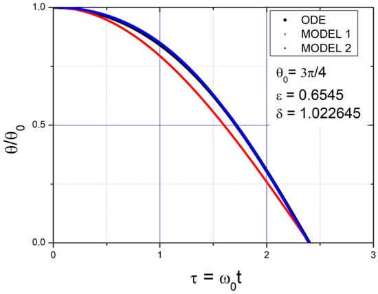 We chose three standard initial angles to compare the results obtained by the numerical solution of the motion differential Equation (1), with Model 1 (system 9) and Model 2 (system 18).