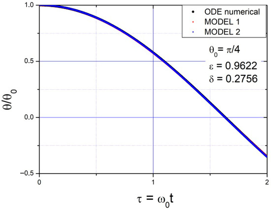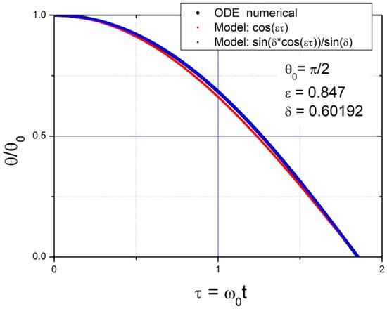 ODE are numerical data. Both models describe very well the relative deviation during the initial quarter period of a pendulum dropping from an initial angle: .