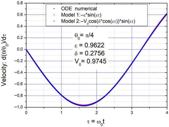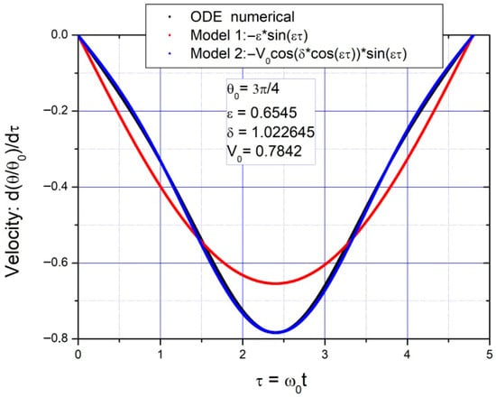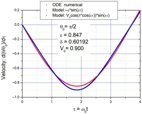 Using the new differential equation of motion (23), we were able to derive differential Equation (30) for the angular amplitude. To obtain analytical solutions, it is preferable to transform it into a velocity, Equation (31).