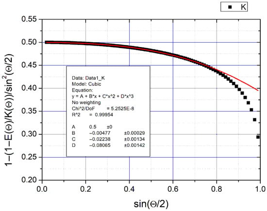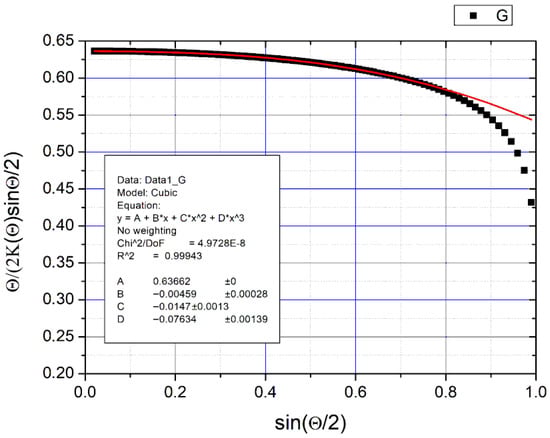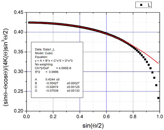 We found that there are three functions , , and that completely affect and dominate each of the friction coefficients. These three functions are calculated in Figure 7, Figure 8 and Figure 9, adjusting to the numerical data. It was found that, for angles up to 90°, each of the functions can be defined by a third-degree polynomial, thus obtaining a matrix (34).