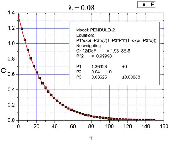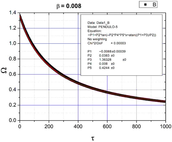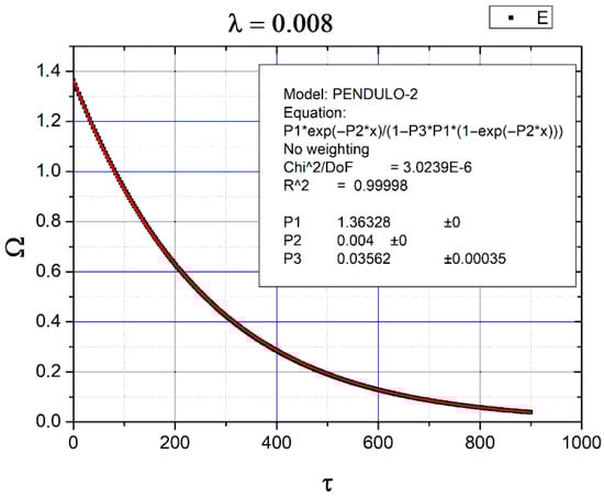 Figure 10 and Figure 11 contain numeric data and adjusting parameters for two cases of a pendulum dropped from an angle of 1.5 rad and acted on only by a viscous force with coefficients λ = 0.008 and λ = 0.08, respectively.