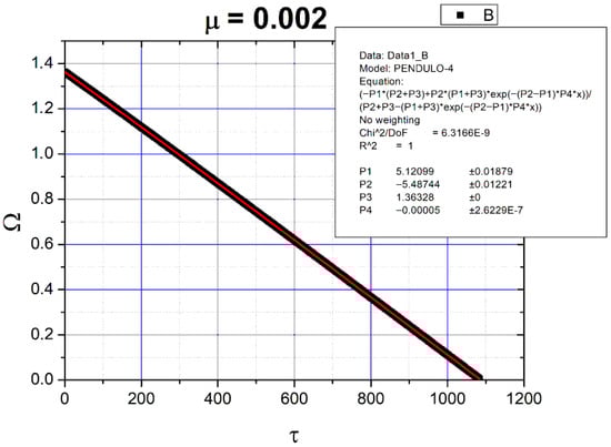 Figure 12 and Figure 13 contain numeric data and adjusting parameters for two cases of a pendulum dropped from an angle of 1.5 rad and acted on only by the constant drag force with coefficients μ = 0.002 and μ = 0.008, respectively.