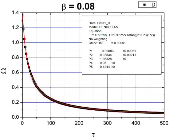 Figure 14, Figure 15, and Figure 16 contain numeric data and adjusting parameters for three cases of a pendulum dropped from an angle of 1.5 rad and acted on only by a turbulent drag force with coefficients β = 0.04, 0.08, and 0.008, respectively.