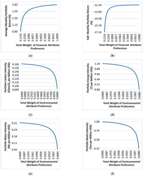 This section presents a sensitivity analysis of the financial and environmental attributes concerning investor preferences. The analysis is conducted by adjusting the total financial and environmental preference weights of investors within the feasible region of the MOO. The preference weights for the portfolio′s average and VaR return are set equally, namely one-half of the total weight of financial attribute preference ( total weight of financial attribute preference). Furthermore, the preference weights for carbon, energy, water, and waste intensities are also set equally, namely one-fourth of the total weight of environmental attribute preference ( total weight of environmental attribute preference). Then, α for the VaR is set at 0.2, indicating that the maximum tolerated loss by the investor is at the 0.01-quantile of the portfolio return. Lastly, we only consider the weights for each . Under this setup, the feasible region is obtained with the total weight of financial attribute preference ranging from 0.1116 to 1.0000 and the total weight of environmental attribute preference ranging from 0.0000 to 0.8884. For each value of the total weight of financial and environmental attribute preferences within the given interval, the average return, VaR return, carbon intensity, energy intensity, water intensity, and waste intensity of the portfolio are determined. The results are illustrated visually in Figure 1.