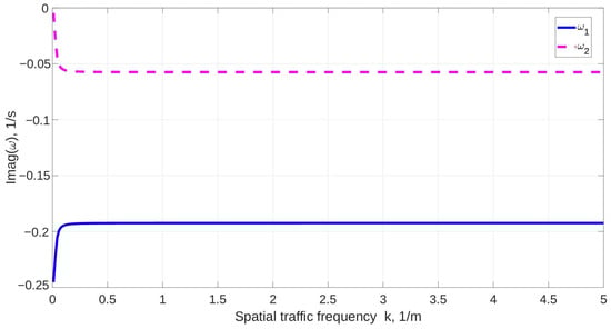 This condition imposes an upper bound on the relaxation time b relative to the anticipation and the slope to ensure that small changes in the leading vehicle decay rather than increase downstream. To assess the string stability, the proposed model was implemented in MATLAB with the parameters s, s, s, m/s, , and the leading vehicle speed achieving the Greenshields distribution. Figure 1 presents the imaginary parts of versus the spatial frequency k. This shows that for all k; hence, the proposed model is string stable.