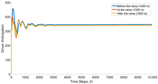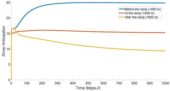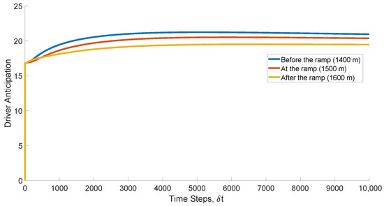 Driver anticipation with the proposed model at 1400 m (before the ramp), 1500 m (at the ramp), and 1600 m (after the ramp) on a 3000 m circular road in good visibility.