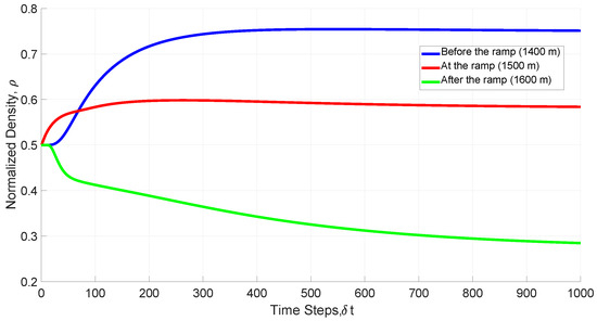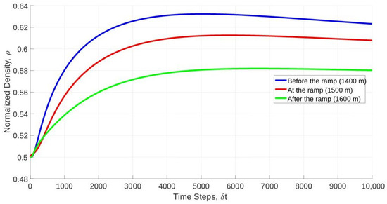 Figure 15 presents the normalized density with the proposed model before the ramp, at the ramp, and after the ramp on a 3000 m circular road in good visibility. At 1400 m (before the ramp), the density is at the 1st time step and increases to at the 200th time step. It is at the 3000th time step and is approximately constant to the 7000th time step before decreasing to at the 10,000th time step. At 1500 m (at the ramp), the density is at the 1st time step and increases to at the 500th time step. It is at the 5000th time step and is approximately constant to the 8000th time step. At 1600 m (after the ramp), the density is at the 1st time step and increases to at the 500th time step. It is at the 6000th time step and is approximately constant to the 10,000th time step. These results indicate that in good visibility, the density before the ramp, at the ramp, and after the ramp increases until about the 4000th time step and is smooth. In poor visibility, Figure 3 shows that the density has greater variability with more abrupt changes.