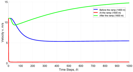 Figure 2 presents driver anticipation with the proposed model before the ramp (1400 m), at the ramp (1500 m), and after the ramp (1600 m) in poor visibility ( m). At the 1st time step, driver anticipation at 1400 m is , while at the 100th time step it is . At the 400th time step, it is and is approximately constant to the 1000th time step. At 1500 m, driver anticipation is at the 1st time step and decreases to at the 5th time step. At the 100th time step, it is and decreases to at the 400th time step and at the 1000th time step. At 1600 m, driver anticipation is at the 1st time step and decreases to at the 100th time step, at the 400th time step, and at the 1000th time step. These results indicate that in poor visibility, driver anticipation at 1500 m is smaller than at 1400 m but larger than at 1600 m. Figure 3 presents the corresponding normalized density with the proposed model. At 1400 m, the density is at the 1st time step and increases to at the 200th time step. It is at the 500th time step and is approximately constant to the 1000th time step. At 1500 m, the density is at the 1st time step and increases to at 200th time step. It is at the 500th time step and is approximately constant to the 1000th time step. At 1600 m, the density is at the 1st time step and decreases to at the 200th time step. It is at the 500th time step and decreases to at the 800th time step and at the 1000th time step. At 1500 m, the density is approximately constant after the 200th time step, while at 1400 m it is approximately constant after the 300th time step, and at 1600 m it is approximately constant after the 600th time step. Figure 4 presents the corresponding velocity with the proposed model. At 1400 m, the velocity is m/s at the 1st time step and decreases to m/s at the 45th time step. It is m/s at the 300th time step and is approximately constant to the 1000th time step. At 1500 m, the velocity is m/s at the 1st time step, decreases to m/s at the 4th time step, and then is approximately constant to the 1000th time step. At 1600 m, the velocity is m/s at the 1st time step and decreases to m/s at the 200th time step. It then increases to m/s at the 300th time step, m/s at the 700th time step, and m/s at the 1000th time step. At 1500 m, the velocity is approximately constant after the 4th time step, while at 1400 m it is approximately constant after the 300th time step. Conversely, at 1600 m it increases to m/s at the 1000th time step.