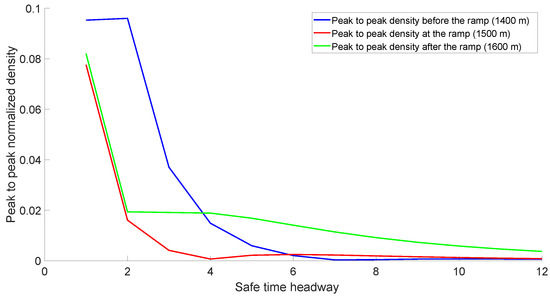 Peak-to-peak normalized density with the proposed model on a 3000 m circular road versus the safe time headway before the ramp, at the ramp, and after the ramp at 1500 m in poor visibility.