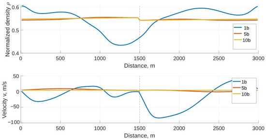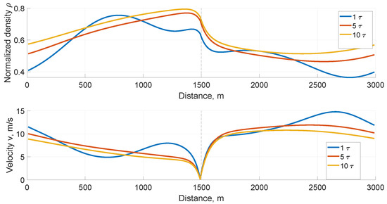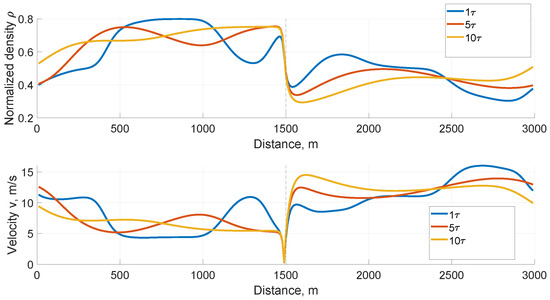 Figure 14 presents the normalized density and velocity with the proposed model for safe time headway , , and on a 3000 m circular road with a ramp at 1500 m in good visibility. This shows that for safe time headway , the density is at 10 m and increases to at 500 m and at 800 m. It is at 1300 m and decreases to at the ramp (1500 m), and is at 1700 m. The density increases to at 2000 m and then decreases to at 2500 m. For safe time headway , the density is at 10 m, increases to at 1400 m, and then decreases to after the ramp at 1640 m. It is at 2500 m and decreases to at 2500 m. At safe time headway , the density is at 10 m, increases to at 1380 m, and then decreases to at 2000 m. The density for all safe time headway values is within the minimum and maximum of 0 and 1, respectively. Further, the variations are smaller for and than for . The velocity at safe time headway is m/s at 10 m, decreases to m/s at 700 m, and then increases to at 1250 m. It is m/s at 1490 m (before the ramp), and increases to m/s at 2500 m. At safe time headway , the velocity is m/s at 10 m, decreases to m/s at 1340 m, and then increases to m/s at 1300 m. It is m/s at 1490 m (before the ramp), and increases to m/s at 2000 m. At safe time headway , the velocity is m/s at 10 m, and decreases to m/s at 1340 m and m/s at 1490 m. It is m/s at 1700 m and increases to m/s at 2000 m. These results show that the velocity is within the minimum and maximum of 0 and 20 m/s, respectively, for all safe time headway values. Further, the variations decrease as the safe time headway increases.