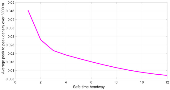 Peak-to-peak density with the proposed model on a 3000 m circular road versus the safe time headway in poor visibility.