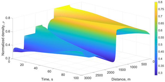 The minimum safe time headway in free-flow traffic is typically between 4 s and 6 s [55], so here s in fog, which is above the maximum free-flow value. The relaxation time is s [56,57], while s [48]. The density distribution at is