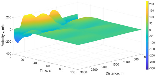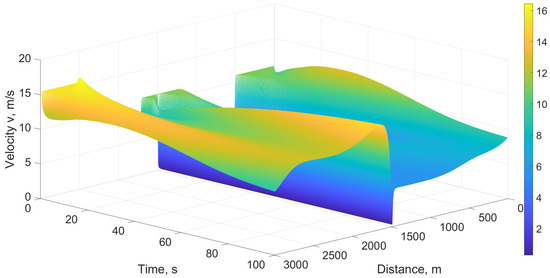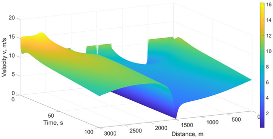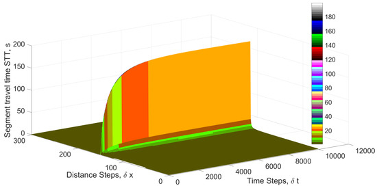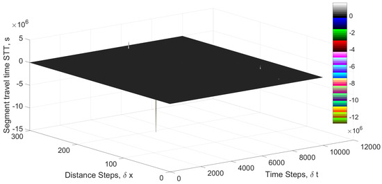 Figure 19 presents the segment travel time (STT) with the proposed model on a 3000 m circular road with a ramp at 1500 m. At the 1350th time step, the STT at 1200 m is s and increases to s at the ramp. At the 9000th time step, it is s at 1000 m and increases to s at 1230 m, s at 1400 m, and s at 1470 m. The maximum is 1985 s at the ramp. This increase in STT as vehicles approach the ramp is realistic as it indicates congestion just before the ramp, as expected. Figure 20 gives the corresponding STT with the PW model. At the 1350th time step, the STT at 1200 m is s, which is impossible. At the ramp (1500 m), it is only s. At the 9000th time step, the STT is s at 1000 m, s at 1230 m, s at 1400 m, s at 1470 m, and then s at the ramp. However, it is −12,800,000 s at 1470 m and time step 3555 and 1,509,000 s at 2860 m and time step 6022. Thus, the proposed model provides realistic and meaningful results, whereas the results with the PW model are unstable and incorrect.