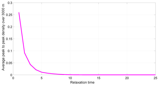 Figure 5 presents the peak-to-peak normalized density versus the safe time headway with the proposed model before the ramp, at the ramp, and after the ramp on a 3000 m circular road in poor visibility. This is the difference between the maximum and minimum density on the road. At 1400 m (before the ramp), the peak-to-peak density is for safe time headway to . It decreases to at and at , and is at . At 1500 m (at the ramp), the peak-to-peak density is at safe time headway and decreases to at and at . It is at and at . At 1600 m (after the ramp), the peak-to-peak density is at safe time headway and decreases to at , at , and at . Thus, the peak-to-peak density at 1600 m varies little from to , but at 1400 m, the variations decrease from to . At 1500 m, the variations decrease with an increase in safe time headway from to .