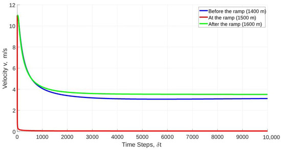 Figure 16 gives the velocity with the proposed model before, at, and after the ramp on a 3000 m circular road in good visibility. At 1400 m (before the ramp), the velocity is m/s at the 1st time step and decreases to m/s at the 2000th time step. It is m/s at the 4000th time step and is approximately constant to the 10,000th time step. At 1500 m (at the ramp), the velocity is m/s at the 1st time step and decreases to m/s at the 300th time step. It is at the 2000th time step and is approximately constant to the 1000th time step. At 1600 m (after the ramp), the velocity is m/s at the 1st time step, decreases to m/s at the 2000th time step, and is approximately constant to the 1000th time step. These results show that before, at, and after the ramp the velocity varies little after the 2000th time step. Further, in good visibility the velocity is smooth at all road locations, but in poor visibility, Figure 4 indicates there is greater variability. Before the ramp, the velocity decreases, and at the ramp, it decreases further within a few time steps. After the ramp, it increases significantly, which indicates there is congestion at the ramp, which later dissipates.