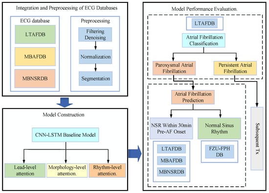 The overall research framework is illustrated in Figure 1. The method standardizes data from three public ECG databases, then constructs a CNN-LSTM model enhanced with hierarchical attention across lead, morphology, and rhythm levels. Performance is evaluated on two tasks: PAAF/PEAF classification using Long-term Atrial Fibrillation Database (LTAFDB) and 30-min AF onset prediction using multisource data, including the Fuzhou University–Fujian Provincial Hospital (FZU-FPH) clinical database, to inform future research.