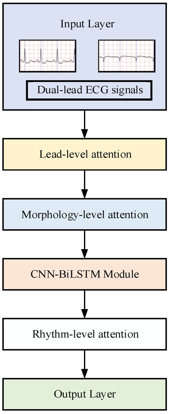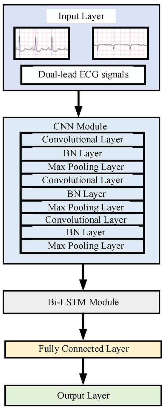 A CNN is typically composed of several types of layers: convolutional layers, activation function layers, and pooling layers. In this study, the parameters of different convolutional layers are designed as follows: The convolution kernel sizes are designed to decrease progressively from 7 × 1 to 5 × 1 and finally to 3 × 1. This coarse-to-fine progression enables shallow layers to capture broader morphology and low-frequency components, while deeper layers specialize in sharper deflections and local transitions [32,33,34]. Meanwhile, the number of kernels increases from 32 to 64 and then to 128, allowing richer feature hierarchies to be extracted as temporal resolution decreases, while empirical tuning confirmed diminishing returns beyond 128 channels [35]. All convolutional layers adopt unit stride with same padding to preserve temporal alignment of atrial and ventricular landmarks, while pooling explicitly reduces dimensionality, enlarges the receptive field, and retains rhythm-critical information [35,36]. For activation functions, ReLU is used in CNN layers to enhance feature sparsity and avoid vanishing gradients, while Tanh is applied in the Bi-LSTM to stabilize temporal dynamics, followed by SoftMax for classification; these are widely accepted choices in ECG CNN–RNN architectures [37]. Baseline architecture details are presented in Table 2.