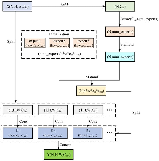 where is the number of experts, and . A dynamic kernel is synthesized: by weighted summation of expert kernels