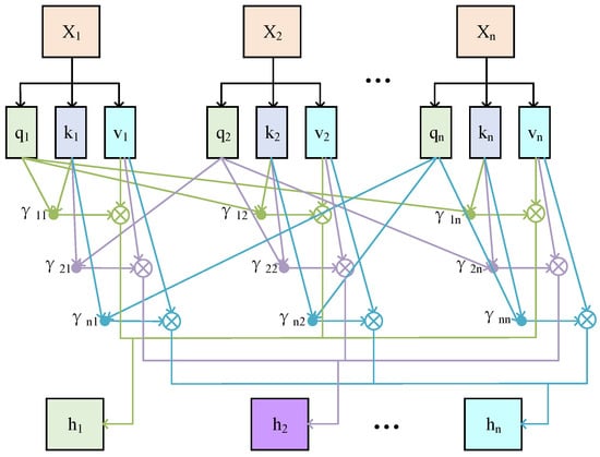 After obtaining the , , and vectors, for each query vector at position , its correlation with key vectors at all other positions is calculated to derive the corresponding attention weights for the key vectors at the remaining positions. Finally, multiplying these attention weights with the value vectors at their respective positions yields the output of the self-attention mechanism, as illustrated in Figure 4.