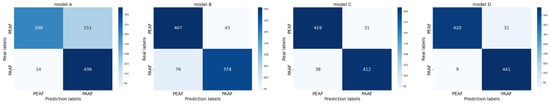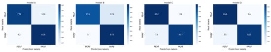 The confusion matrix generated on the validation set is presented in Figure 6. The calculation results of various indicator performances of different models on the validation set are shown in Table 5. The accuracies of models A, B, C, and D are 81.66%, 86.77%, 92.33%, and 95.66%, respectively. The accuracy gradually increases from model A to model D, which proves the effectiveness of the multilevel attention mechanism model.