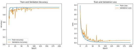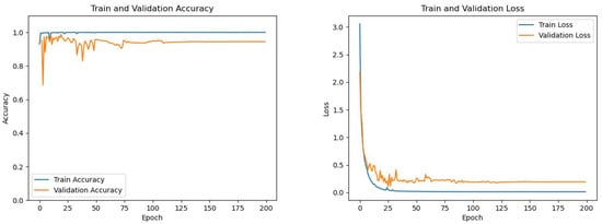 During the model training, the curves showing the changes in the accuracy and loss function values of the training set and the validation set with the number of training batches are shown in Figure 7.