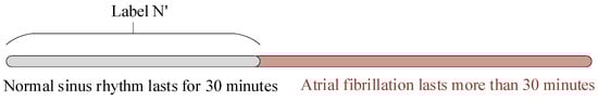 For the experiment of predicting PAAF in advance, the databases MBAFDB, LTAFDB, MBNSRDB, and FZU-FPH were used. The normal sinus rhythm data within 30 min before the onset of PAAF in patients were extracted. As shown in Figure 8, these data were labeled as N’. After screening, 23 patients from the LTAFDB and 19 patients from the MBAFDB met the criteria. Then, 18 subjects from the MBNSRDB were regarded as a normal sinus rhythm population who had never experienced AF. Completely normal sinus rhythm data were extracted from them and labeled as N.