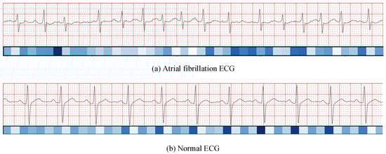 From Figure 11a, which corresponds to AF samples, the highlighted regions coincide with the disappearance of the P wave and the emergence of continuous, irregular F waves. This indicates that the model correctly attends to clinically relevant abnormalities when detecting AF. In contrast, Figure 11b shows normal ECGs, where the attention distribution is relatively uniform and primarily concentrated on the QRS complex. This suggests that for normal rhythms the model emphasizes ventricular depolarization, consistent with clinical interpretation.