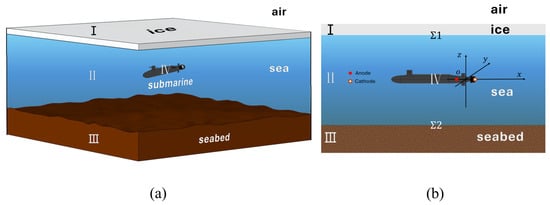Schematic of the submarine and electric field domains under Ice. (a) A 3D schematic diagram of a submarine navigating in waters with an ice-covered surface, (b) A two-dimensional schematic diagram of a submarine navigating in waters with an ice-covered surface.