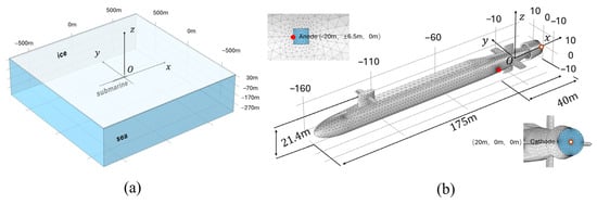 Neglecting the effects of air, seabed, and ocean currents, and setting the seawater–seabed interface as an insulating boundary condition, a 3D simulation domain consisting of an ice layer, seawater, and a submarine, along with their corresponding physical models, was established in COMSOL, as shown in Figure 2a.The simulation domain was defined as a cuboid, with the seawater measuring 1500.0 m × 1500.0 m × 400.0 m and the ice layer measuring 1500.0 m × 1500.0 m × 4.0 m. The coordinate system was aligned with that shown in Figure 1b, with the origin set at the geometric center point on the 30.0 m depth plane underwater, following the coordinate origin definition provided in the preceding section. The upper surface of the ice layer was set at z = 30 m, and the seawater–seabed interface was fixed at .