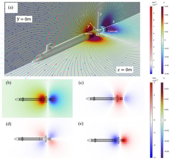 Based on the parameters defined in Section 3.1, the “AC/DC” module in COMSOL, designed for solving static and dynamic electric field problems, was employed to solve the simulation model constructed in Figure 2. This produced the current and potential distributions on the z = 0 m and y = 0 m planes, as well as on the submarine surface. The results are presented in Figure 3a, where arrowed streamlines indicate the direction and path of the current flow, and color gradients represent the magnitude of the current density. As evident from the figure: