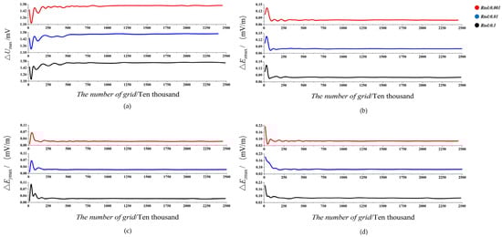 The following analysis systematically increases mesh density from coarse to fine levels, examining simulation results for four physical parameters—ΔUmax, ΔExmax, ΔEymax, and ΔEzmax—under Rtol of 0.1, 0.01, and 0.001. The corresponding results are presented in Figure 4a–d.