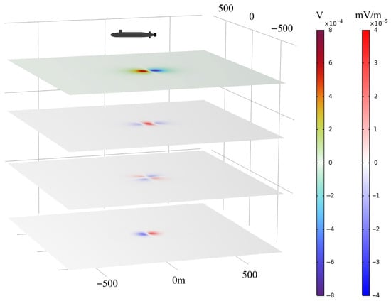 Building upon this analysis, the potential difference ΔU on two planes under ice-covered conditions was calculated to investigate the impact of the ice layer on the CRSE field beneath the submarine. The corresponding results are presented in Figure 11.