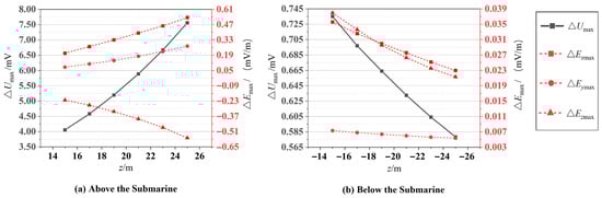 With the same parameter settings as those described in Section 3.1, the depth of the measurement plane was varied to simulate and assess the influence of ice layers on the submarine CRSE at different depths. Figure 6a,b illustrate the depth-dependent variations in four CRSE parameters—ΔUmax, ΔExmax, ΔEymax, and ΔEzmax—within the sub-ice marine regions both above and below the submarine. The results show that the closer the measurement plane is to the ice layer, the more pronounced the influence of the ice layer on these physical quantities is, indicating a near-field enhancement effect. Notably, in the seawater above the submarine, ΔUmax, ΔExmax, and ΔEymax are positive, whereas ΔEzmax is negative. This occurs because the vertical component (Ez) of the electric field strength in the seawater above the submarine is inherently negative, and the presence of the ice surface further increases its magnitude. Additionally, the rate of change with depth for all four physical quantities is greater above the submarine than below, as the measurement points above are closer to the ice layer and thus more significantly affected. As shown in Figure 6b, the transverse electric field component Ey below the submarine is relatively insensitive to changes in measurement depth, indicating that tracking variations in Ey may not be the most effective approach for determining the target position in practical detection scenarios.