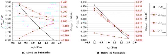 By varying the ice layer conductivity (σ1) while maintaining all other simulation parameters consistent with those outlined in Section 3.1, the influence of σ1 on the submarine’s CRSE was investigated. When σ1 was assigned values of 0.025 S/m, 0.5 S/m, 1.0 S/m, 1.5 S/m, 2.0 S/m, and 2.5 S/m, the corresponding values of four physical quantities—ΔUmax, ΔExmax, ΔEymax, and ΔEzmax—were computed at the depth plane of z = 20 m above the submarine to assess the effect of the ice layer conductivity. The simulation results are presented in Figure 7a. For comparative analysis, the same physical quantities were also calculated at z = −20 m below the submarine, with the results illustrated in Figure 7b.