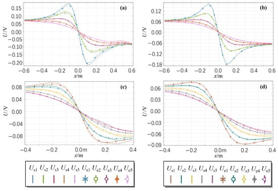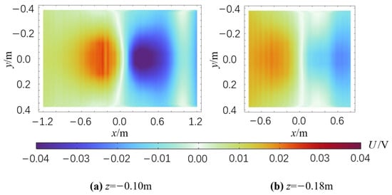 - In Figure 10a,b, the maximum potential value on the plane z = −0.10 m under ice-covered conditions is 0.1777 V, whereas it is 0.1581 V for no ice layer conditions, such as ΔUmax = 0.0196 V in Figure 11a. Similarly, in Figure 10c,d, the maximum potential value on the plane z = −0.18 m with ice coverage is 0.0946 V, whereas the no ice layer maximum is 0.0756 V, so ΔUmax = 0.0190 V in Figure 11b. These results demonstrate that the closer the measurement plane is to the ice layer, the more significant its influence becomes. This finding aligns with the conclusions presented in Section 5.2 of this study.