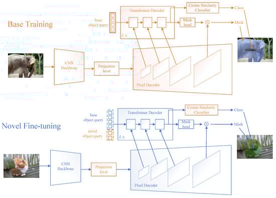 Our framework retains the core structure of Mask2Former, which consists of a CNN backbone, pixel decoder, and transformer decoder. To adapt it to incremental few-shot scenarios, three key modifications are introduced. Specifically, we replace the original fully connected classification head with a cosine similarity classifier [9]. This replacement aims to enhance the discriminability between the embeddings of base and novel classes, enabling more precise differentiation in the context of few-shot learning. Additionally, a dedicated set of novel object queries is added within the transformer decoder. These queries are distinct from the base object queries that are trained on base classes, and their role is to capture features that are specific to novel classes, facilitating the model’s ability to learn about these new categories. Moreover, local POD knowledge distillation is applied [12]. During the fine-tuning process, this technique performs feature alignment between the base and novel models, which is crucial for mitigating catastrophic forgetting—a common issue where learning new knowledge causes the model to lose previously acquired information about base classes. Overall, the framework operates through two sequential stages. First, base training is carried out on large-scale base-class data. This stage is designed to enable the model to learn generalizable features that can serve as a foundation [58]. Second, novel fine-tuning is performed on limited novel class samples. The goal of this stage is to adapt the model to new classes while preserving the prior knowledge gained from the base training stage (Figure 1).