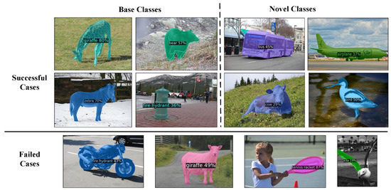 COCO Dataset [46]: As the primary evaluation benchmark, COCO contains 80 object classes with dense annotations. Following the widely adopted split in FSIS research [10,45], we divide the classes into 60 base classes (e.g., “airplane”, “bus”, “dining table”) and 20 novel classes (e.g., “bear”, “zebra”, “umbrella”), where the novel classes overlap with the VOC dataset to ensure consistency with existing evaluations. The dataset includes 80,000 training images (1.5 million instances), 35,000 validation images [63], and 5000 test images, covering diverse scenes such as urban streets, rural landscapes, and indoor spaces. This diversity allows us to assess the model’s performance across varying object scales (from small objects like “cup” to large ones like “truck”), occlusion levels, and lighting conditions.