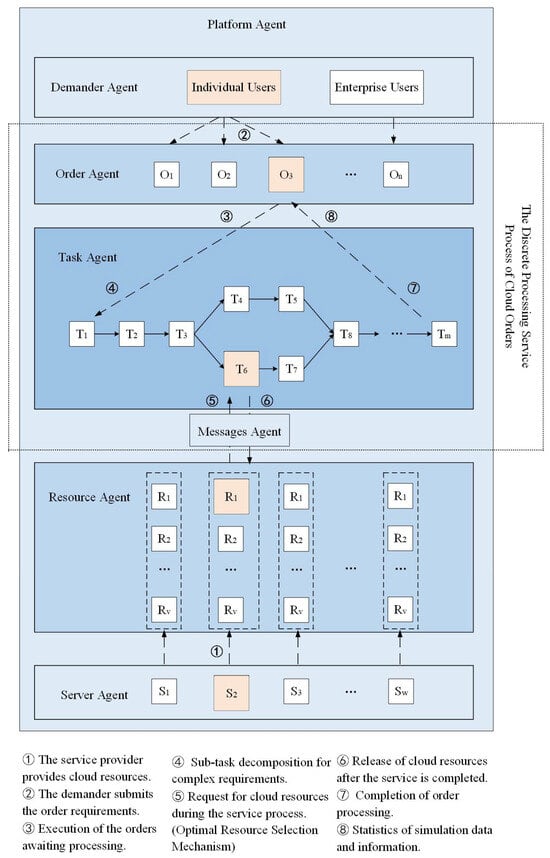 The overall structure of the hybrid simulation model proposed in this paper is shown in Figure 1, which clarifies the relationships between cloud service entities and the connection between the cloud manufacturing entity model and the cloud service process model. The basic operational logic of the hybrid simulation model can be summarized as follows:
