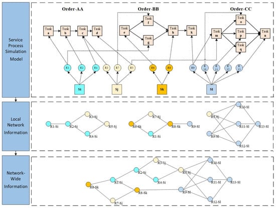 - The service process simulation model in Figure 3 includes three types of cloud manufacturing orders: Order-AA, Order-BB, and Order-CC. For example, Order-AA follows a serial processing path with four tasks: Task a, Task b, Task c, and Task d. The corresponding resources are R1-Si (affiliated with service provider Si), R2-Si, R4-Si, R3-Sj (affiliated with service provider Sj), and R5-Sj. This establishes connection relationships among the five resources.