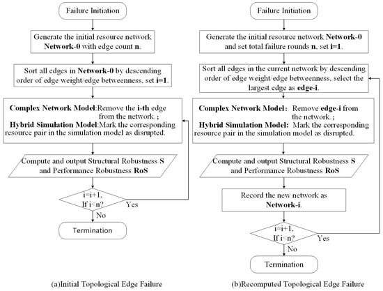 The detailed process of resource edge failure is shown in Table 2, and the failure flowchart is presented in Figure 4. For resource edge failures, two structural importance indicators are selected: edge weight and edge betweenness []. Edge weight represents the frequency of collaboration between cloud resources—the higher the edge weight, the closer the collaborative relationship. Edge betweenness reflects the structural and functional control of associated resources over the entire cloud manufacturing system—the higher the edge betweenness, the stronger their control. Additionally, two calculation modes are considered: static failure based on the initial topology and dynamic failure based on the recomputed topology. The former determines the sorting, once, of all resource edges by weight and betweenness based on the initial network topology (Network0), while the latter dynamically recalculates the latest edge weights and betweenness rankings after each edge failure.