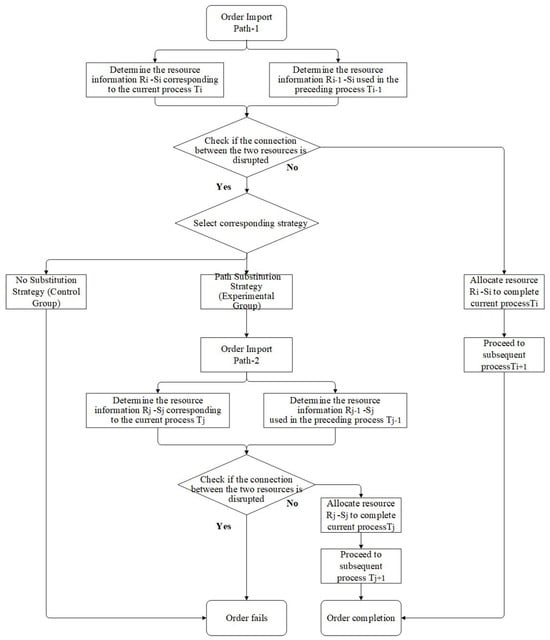 - No substitution strategy (control group): each order corresponds to only one default processing path (Path 1). During Path 1 processing, the system continuously checks whether the cloud resource requested for the current operation (Ri-Si) can communicate normally with the resource used in the preceding operation (Rj-Sj). If the connection is normal, processing proceeds to the next operation until completion. If the connection is interrupted, Path 1 is deemed unavailable, the order cannot be processed further, and it is added to the failed order set with relevant information recorded. The logical flow of the two strategies is illustrated in Figure 5.