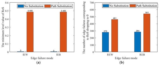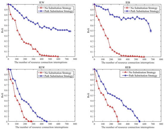 As shown in Figure 7a, under the IEW and IEB connection interruption modes, the RoS value of the no substitution strategy eventually drops to 0, while the RoS value of the path substitution strategy remains at a certain level (0.485). This indicates that the path substitution strategy significantly improves the system’s performance robustness under the two initial topology interruption modes. As shown in Figure 7b, the REB and REW connection interruption modes cause greater damage to the system’s performance robustness, and the RoS values corresponding to both strategies eventually drop to 0. By comparing the number of connection interruptions when RoS drops to 0, it can be seen that the no substitution strategy only requires fewer interrupted associated resources (279 and 284) to make its RoS value drop to 0, while the path substitution strategy requires more failed associated resources (461 and 541) to make RoS drop to 0. This indicates that the path substitution strategy also significantly improves the system’s performance robustness under the two recomputed topology interruption modes.