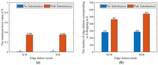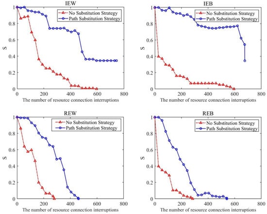 As shown in Figure 9a, under the IEW and IEB connection interruption modes, the S value of the no substitution strategy eventually drops to 0, while the S value of the path substitution strategy remains at a relatively high level (0.346). This indicates that the path substitution strategy significantly improves the system’s structural robustness under the two initial topology interruption modes. As shown in Figure 9b, the REW and REB connection interruption modes cause greater damage to the system’s structural robustness, and the S values corresponding to both strategies eventually drop to 0. By comparing the number of connection interruptions when S drops to 0, it can be seen that the no substitution strategy only requires fewer interrupted associated resources (279 and 284) to make its S value drop to 0, while the path substitution strategy requires more failed associated resources (461 and 541) to make S drop to 0. This indicates that the path substitution strategy also significantly improves the system’s structural robustness under the two recomputed topology interruption modes.