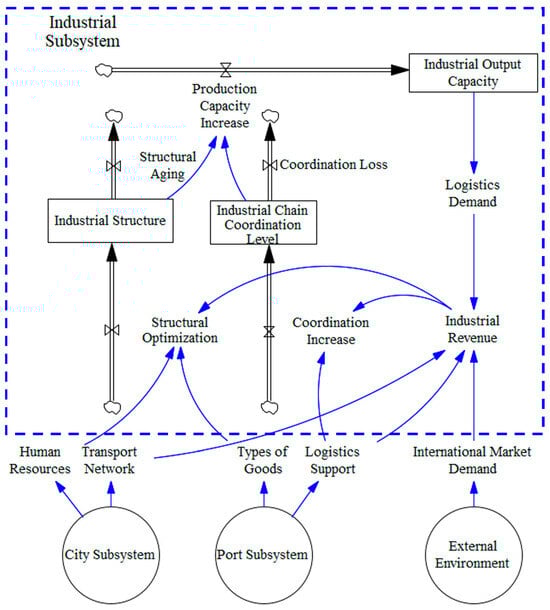 The industrial subsystem constitutes the production core of the port–industry–city system, acting as the primary source of logistics demand and a key driver of regional economic output. It typically develops around port-adjacent industrial zones, where sectors such as mineral processing, chemicals, and advanced manufacturing form integrated value chains from raw material intake to export. The dynamics of this subsystem can be understood through its internal mechanisms and external dependencies, as illustrated in Figure 2.