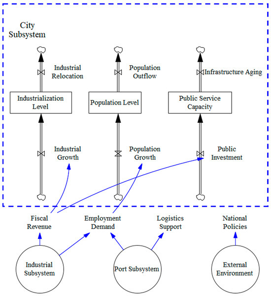 These internal components jointly influence the efficiency and adaptability of the city subsystem, while also shaping the operational environment of the port and industry subsystems. As industrial and port development expand demand for services and labor, the city responds by upgrading infrastructure and absorbing labor inflows, reinforcing system-level integration.