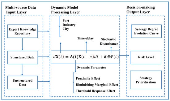This section proposes an integrated application framework for the port–industry–city co-evolution model, systematically combining core mechanisms from the time-delay dynamical model and state-dependent interaction model. It establishes a complete pathway from theoretical modeling to empirical analysis. As shown in Figure 4, bidirectional mapping between theoretical models and real-world systems is constructed through multi-source data fusion and dynamic parameter adaptation mechanisms.
